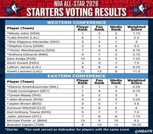 全明星首发出炉!东契奇加冕票王,詹姆斯无缘首发